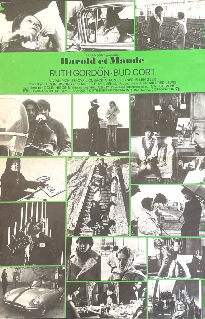 Original French Press Book for the classic 1971 Hal Ashby  romantic black comedy (about a depressed, death-obsessed 20-year-old man-child who spends his free time attending funerals and staging fake suicides in front of his mother, but who then meets a joyous eighty year old woman who helps him to learn to enjoy life). Great soundtrack by Cat Stevens.