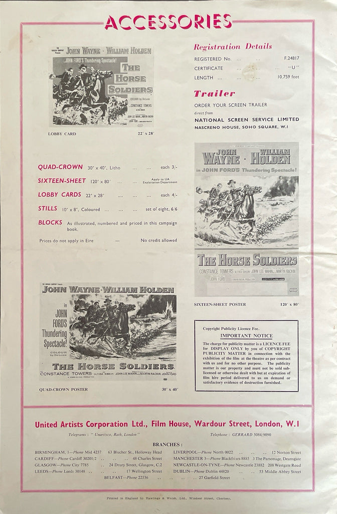 Original Rare UK Press Book (including Synopsis) for the classic 1959 John Ford Civil War cavalry action thriller - "The Horse Soldiers ...rides where only the great ones go!"; "The Big Men Ride - And Nothing Can Stop Them! The Big Men Clash - And Nothing Can Match Them!"; "as the raiders on horseback who rode like thunder... And struck like lightning!"; "John Ford's Thundering Spectacle"