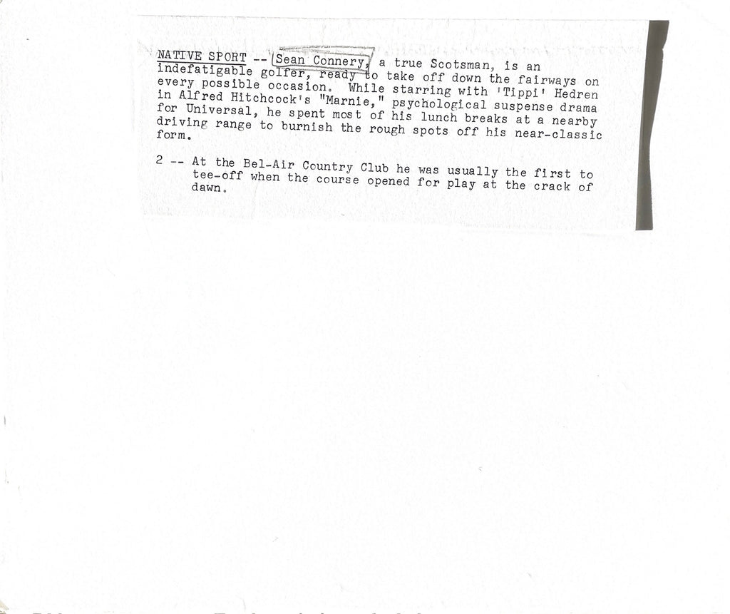 Original US Press Still for the 1964 Alfred Hitchcock romantic mystery kleptomaniac suspense thriller - "Only Alfred Hitchcock could have created so suspenseful a sex mystery!" Great candid shot of Sean Connery on the golf course during filming.