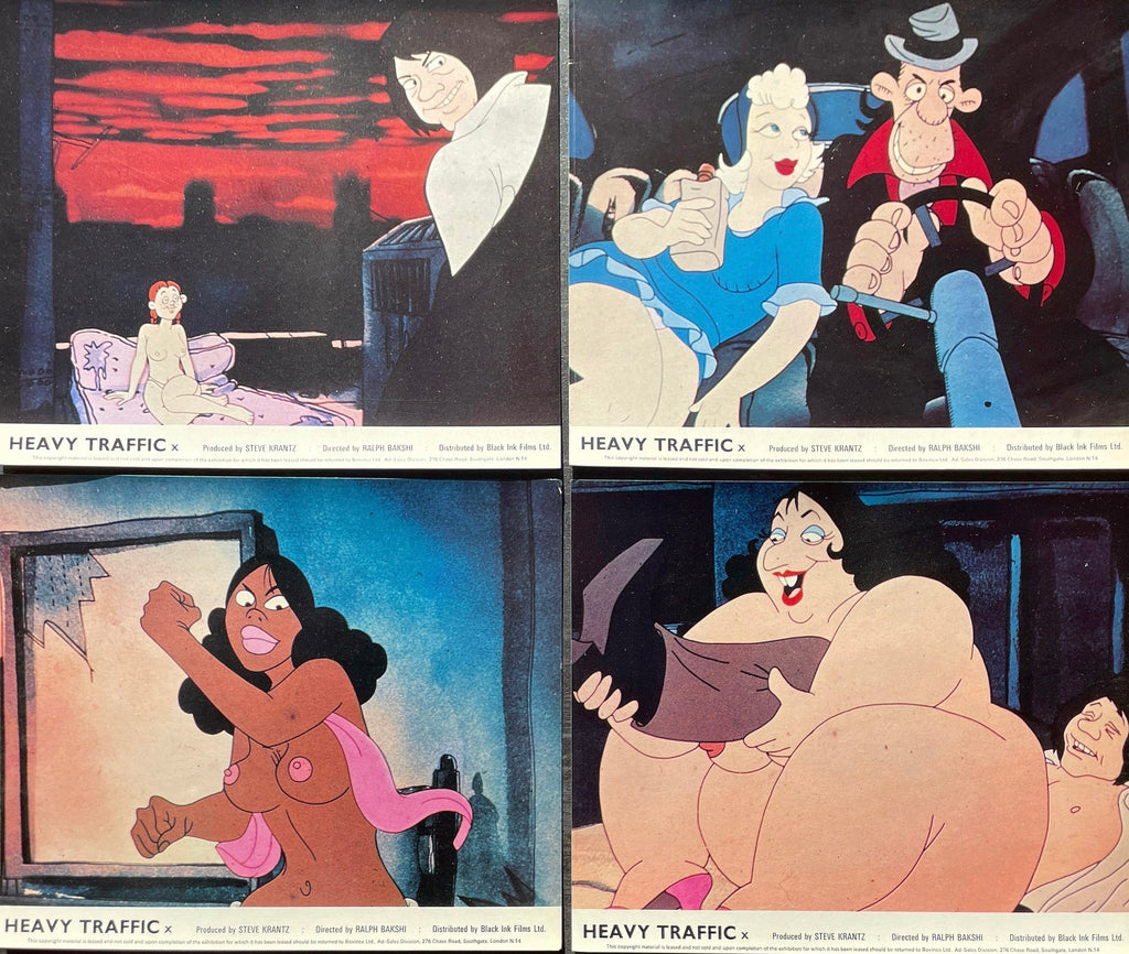 Original UK Front of House Set of 8 Stills for the 1973 Ralph Bakshi AIP animation "mature humor" cartoon sexploitation thriller - "More spice ...from the makers of 'Fritz the Cat'"; "...Heavy Entertainment!"; "The amorous life and misadventures of a virginal young pinball player...his chicks...his chums and a host of assorted weirdos in all colors"; "Heavy Entertainment! from the makers of 'Fritz the Cat"; "Written and Directed by Ralph Bakshi"; about an aspiring animator who has to deal with bad situations all around him)